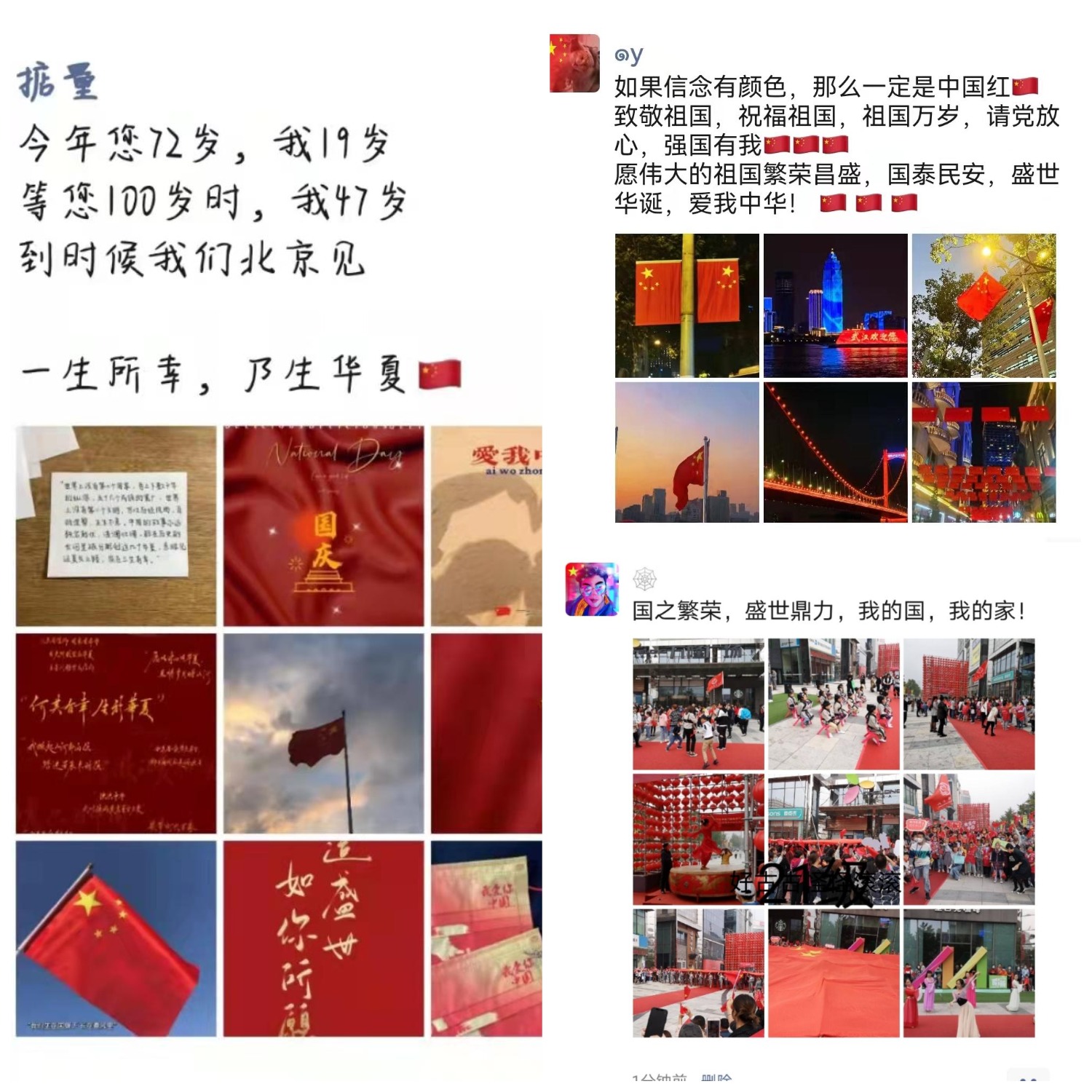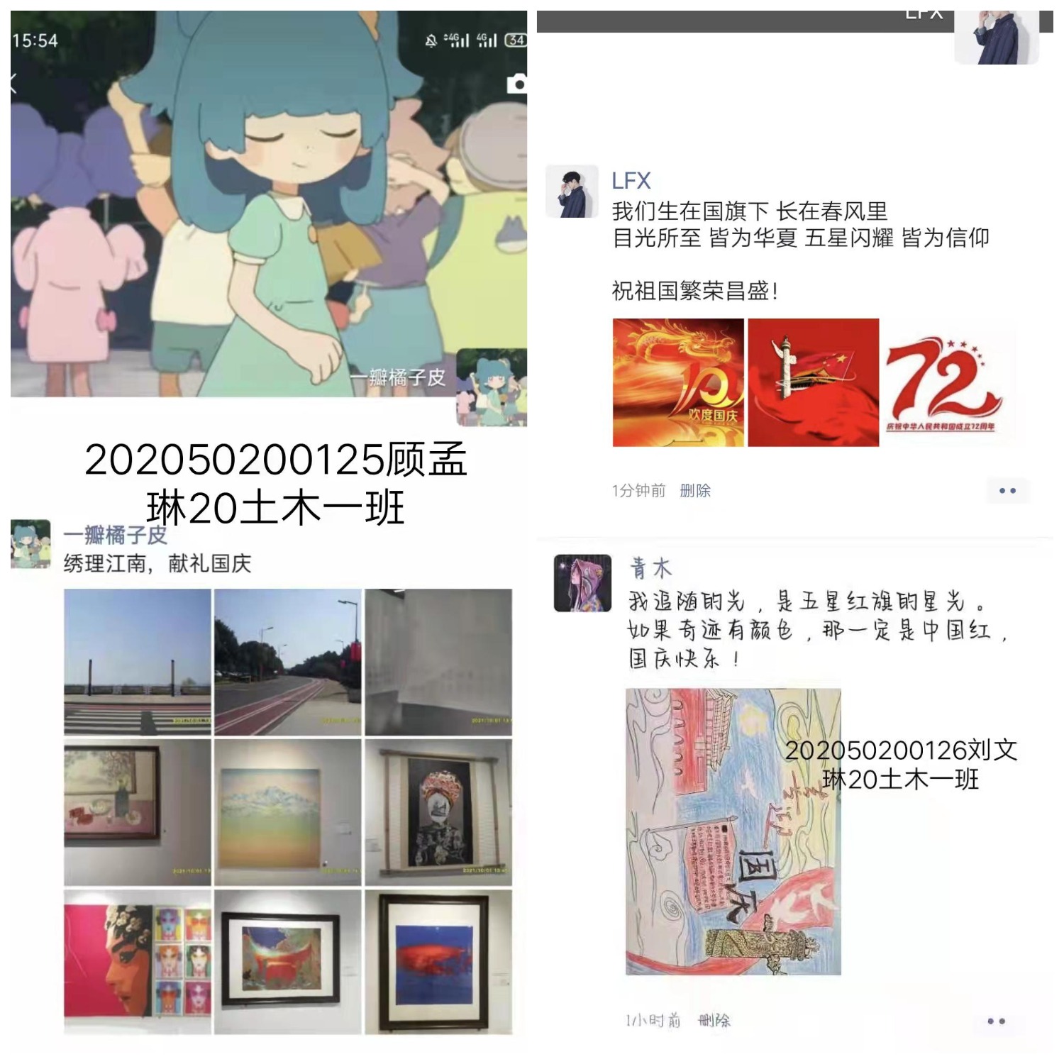 本次活动在符合当地防疫要求下进行,同学们踊跃参加,通过拍摄视频、照片、手写贺语以及手工制作贺卡、绘画等方式来记录国庆,欢度国庆。通过丰富多样的呈现方式,表达同学们对新中国成立72周年的深情祝福,抒发了青年老员工的爱国之情。同学们用简单的祝福语表达自己的心声和情怀;用镜头记录下一幕幕温馨感人、正能量满满的瞬间;用自己亲手制作的绘画和贺卡,表达对祖国母亲美好真挚的祝愿。