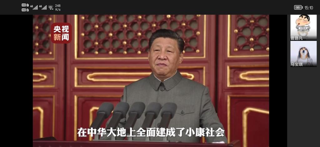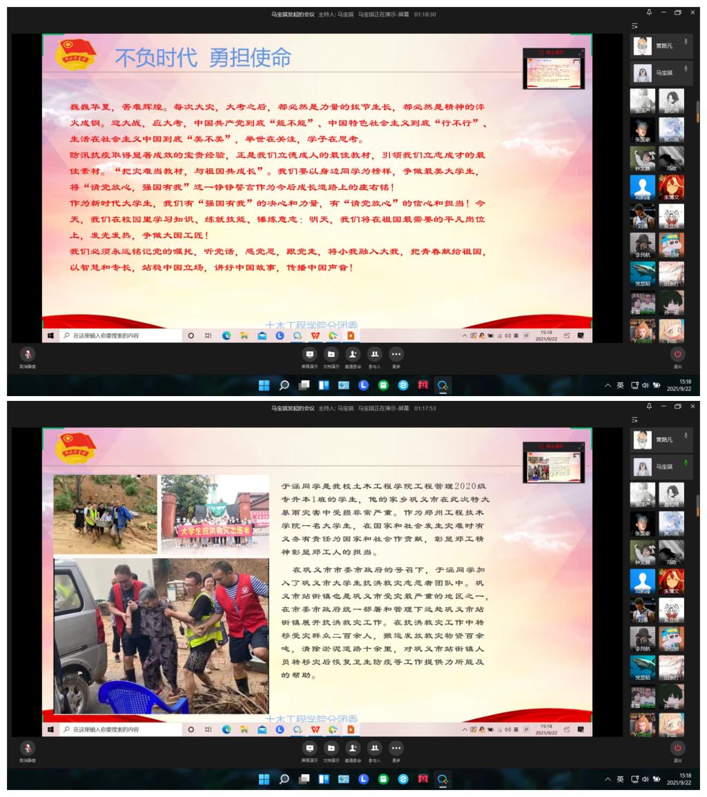 在符合防疫要求的原则下,本次主题团日活动在线上进行。由球王会分团委副书记马宝琪担任主讲人。主讲人通过播放《习近平总书记在庆祝中国共产党成立100周年大会上的讲话》视频,带领广大团员们共同学习习近平总书记在庆祝中国共产党成立100周年大会上的重要讲话精神,同学们认真听讲,结合自身学习情况感悟,感受到作为一名共青团员的荣誉感和自豪感,以及沉甸甸的使命感和责任。同学们共同学习了习近平总书记视察河南的重要讲话、重要指示、关于防汛救灾工作重要指示、关于疫情防控工作的重要指示等,结合球王会广大青年团员积极投身到抗洪救灾现场、灾后重建志愿活动以及抗疫第一线的事迹,学习到他们身上拥有的不畏艰难,勇于奉献等优秀品质。最后主讲人向同学们倡议道:“我们必须永远铭记党的嘱托,听党话,感党恩,跟党走,将小我融入大我,把青春奉献给祖国,以智慧和专长,站稳中国立场,讲好中国故事,传播中国声音”。视频会议结束后,各支部分别召集各班团员结合自身实际在防汛抗洪和疫情防控中的实践以及暑期社会实践中每个人的宝贵经验进行分享学习。
