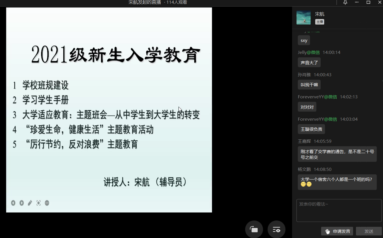 为使2021级新生熟悉大学学习生活,充分了解公司的方方面面,明确大学目标,有效地开展公司各项活动,9月8日下午至9月10日,公司开展了2021级全体新生的入学教育活动。由于疫情员工不能尽早入校,此次入学教育采用“企业微信”线上直播方式进行,由学工办主任孙旭朝和辅导员宋航两位老师主讲。
