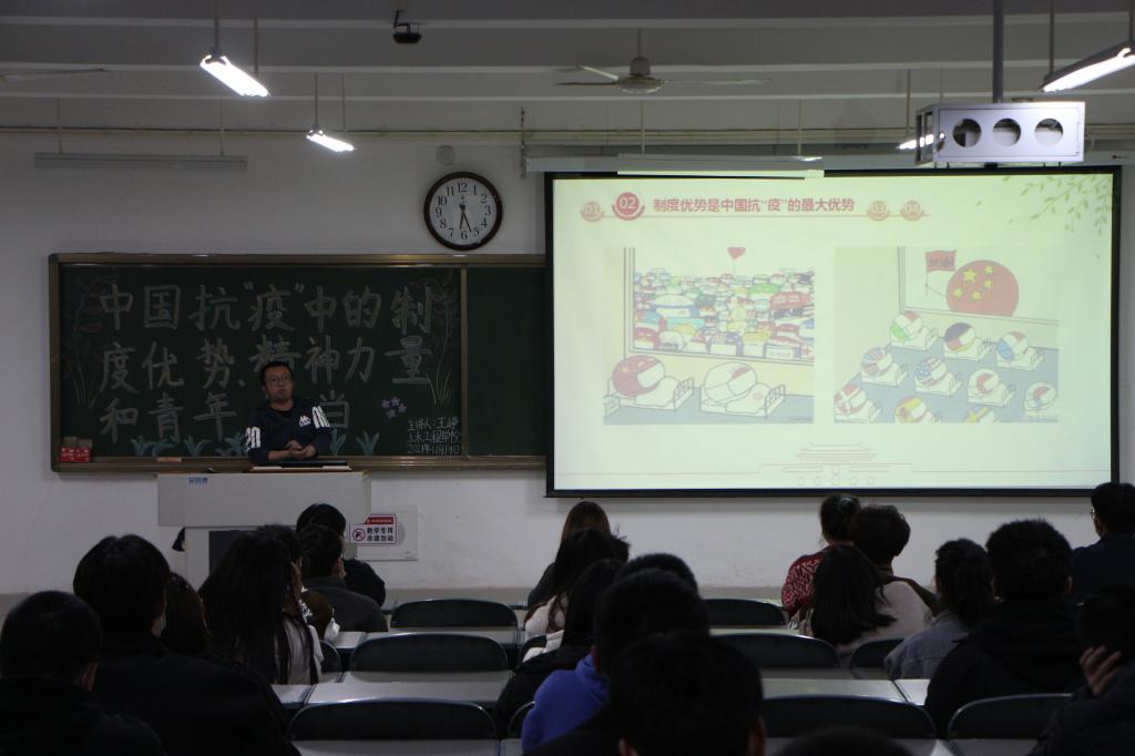 为引领广大青年进一步坚定制度自信,不断传承和发扬中国精神,激励青年勇于担当,励志报效祖国,2021年11月19日晚上6点,球王会在金河校区综合楼208教室举办以“中国抗‘疫’中的制度优势、精神力量和青年担当”为主题的第三次青年马克思主义者培养活动。