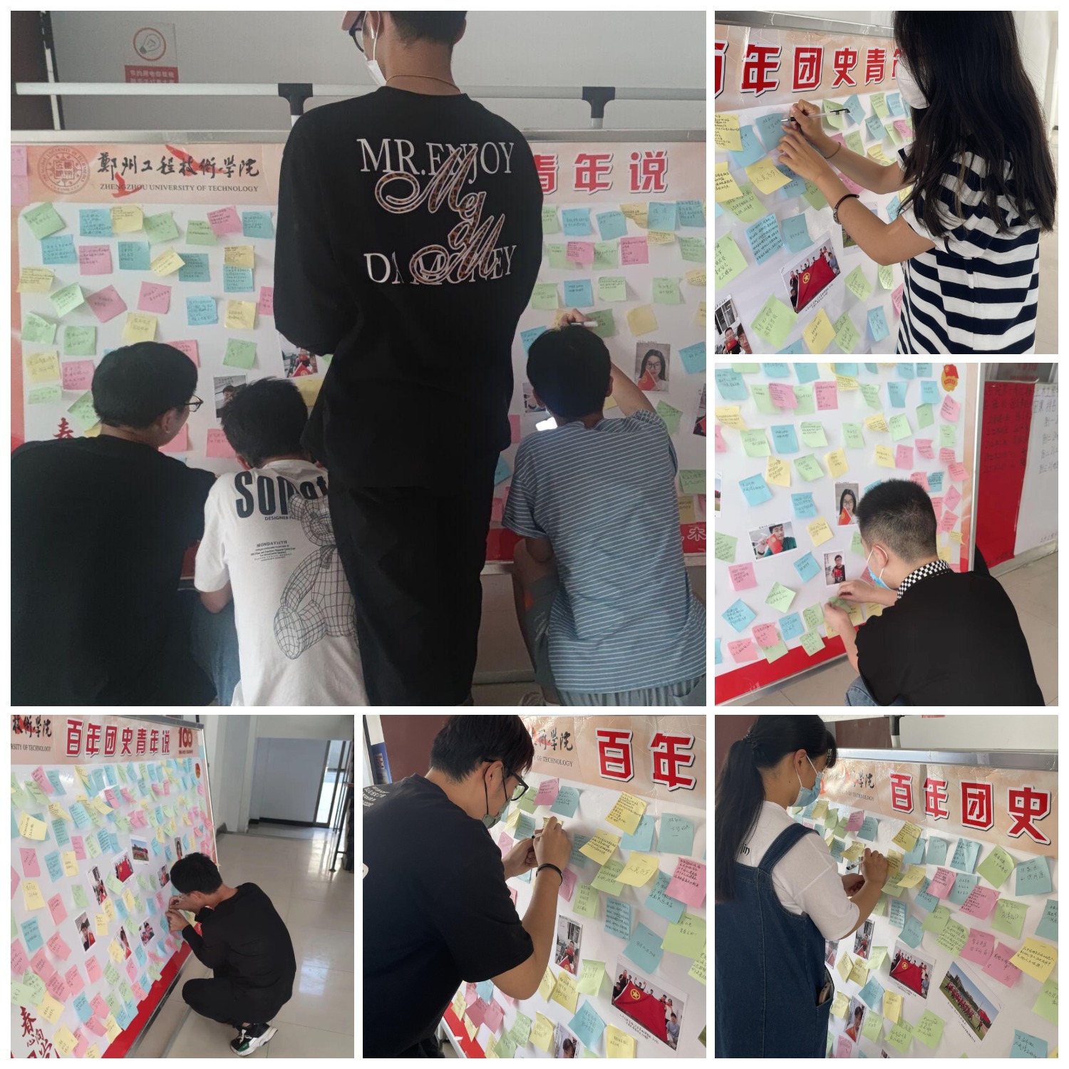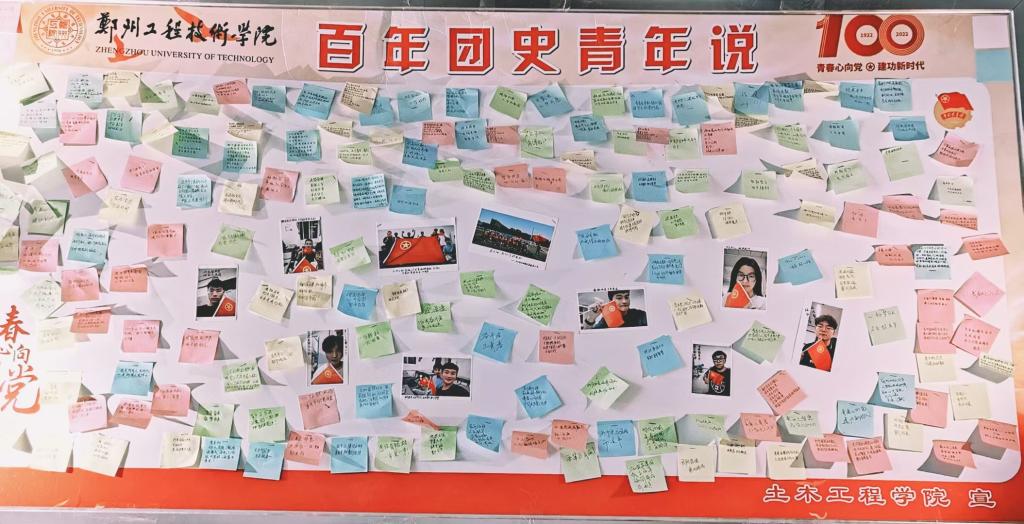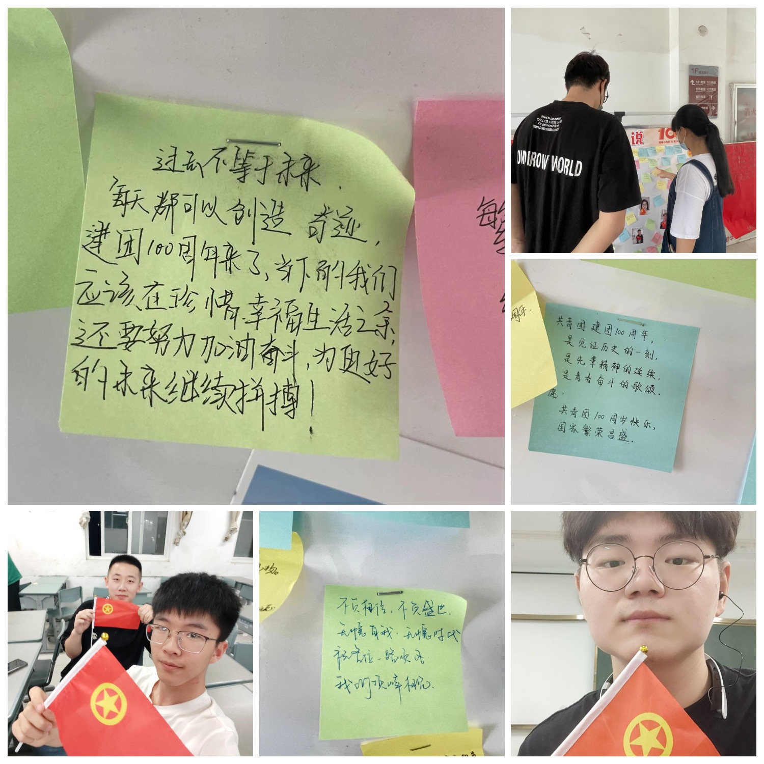 本次活动分为三个部分:“我为大家讲团史”、“我为团团献祝福”、“我和团团合个影”。同学们在留言板上写下对“百年团史”最深刻的记忆片段,以及对共青团的美好祝福,还拍摄了含有共青团元素的照片,展示青年团员的风采,传递积极向上形象,表达了自己对百年团史的了解和对未来的期望。回顾百年团史,在中国共产党的带领下,广大青年不畏困难、勇当先锋书写了中国青年运动的华章,青春新时代,奋斗正当时。王歌同学说:“今年是中国共青团建团100周年,身为新时代青年的我们,承接历史给予我们的使命,肩负起先辈们的理想,努力前行。”