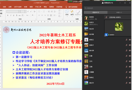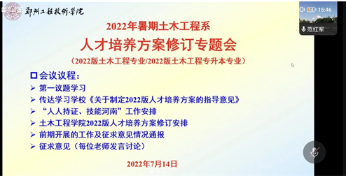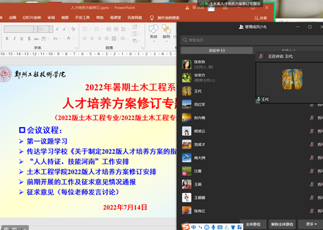 2022年7月14日下午,土木工程系负责人宋荣方主持召开了2022版土木工程专业人才培养方案修订专题会,进一步落实2022版人才培养方案修订工作。会议通过企业微信在线召开,球王会经理范红军、教学负责人王代、以及土木工程系全体教师参加了会议。