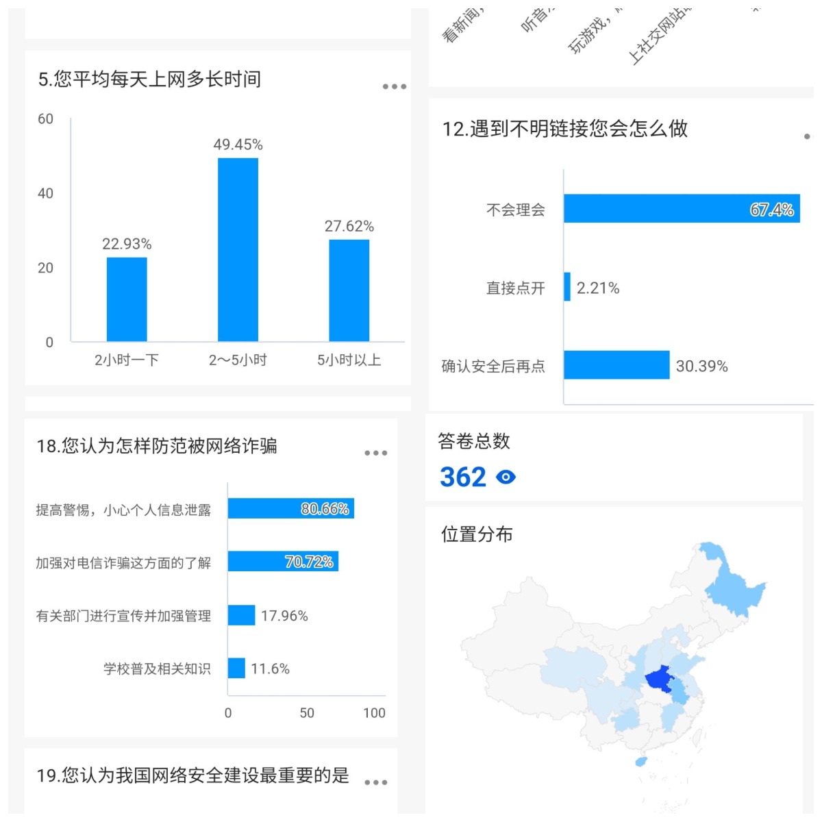 本次活动主要分为两部分,网络安全知识宣传部分和网络安全问卷调查部分。第一部分主要通过公众号“郑工土木团学”向同学们进行网络安全方面的知识宣传。通过推送三次网络安全宣传周专题学习,让同学们学会如何提高防范意识,共建网络安全,如何维护数据安全做好信息安全防护,怎样保护账户密码安全和网上安全交易等。第二部分是问卷调查,以网络问卷调查的方式了解同学们对网络安全知识的掌握程度和对网络安全的重视程度,同学们积极响应,参与网络安全知识答题。通过宣传和调查,培养同学们面对繁杂网络的判断能力,使同学们的网络安全知识得到了进一步巩固和加强,有效提升了同学们网络安全防范意识,增强同学们抵制网络诈骗等违法犯罪活动“免疫力”。
