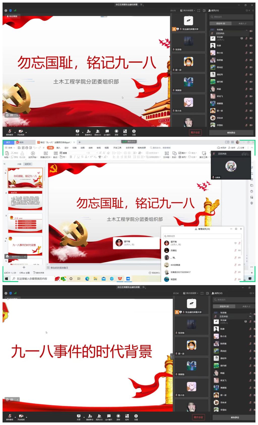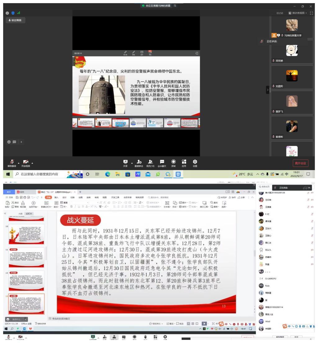本次主题团日活动以团支部为单位进行线上学习,团支书担任主讲人。通过带领同学们回顾“九一八”事变的时代背景、事件经过、社会影响,让同学们与先辈们强烈的爱国之心产生共鸣。其次,主讲人从表层次与深层次讲述了“九一八”事变造成的损失,深痛地阐述着“九一八”事变给社会以及人民带来的灾难性的打击。最后,主讲人强调到,同学们要增强对历史的感悟,要树立“外患意识”、增强爱国情怀,务必铭记历史,毋忘屈辱,以青春报效国家,肩负起强国之任。同学们纷纷表示,作为新时代老员工,生逢盛世、肩负重任,更要在学习党史中悟原理、明使命,厚植爱党爱国情怀,从往昔苦难中汲取力量和智慧,用更宽广的视野面向未来,让爱国主义的伟大旗帜在心间高高飘扬。