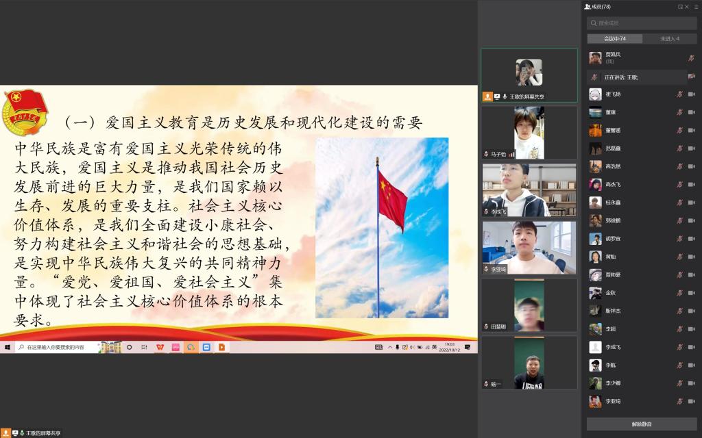 同学们按照要求,提前十五分钟入会且全程出镜,会议过程严格遵守团课纪律,认真听讲,积极发言互动。本次团课由四部分组成,分别是明确爱国主义教育的意义、爱国主义教育的基本内容、爱国英雄事迹展示和用行动诠释爱国。主讲人强调爱国主义是中华民族的民族心、民族魂,是中华民族最重要的精神财富,是中国人民和中华民族维护民族独立和民族尊严的强大精神动力。在讲解过程中,主讲人播放了“守岛人”王继才、“中国保尔”朱彦夫的伟大事迹视频,让土木学子真真切切地感受到当代爱国主义精神,随后主讲人请同学发言,分享自己对于爱国主义的理解和认识,每位同学都认真地思考,深刻地描述了自己心中的爱国主义。21级智能建造的吴佳鹏同学发言说,我们应牢记新使命,践行爱国心,在以后的日子里努力拼搏,让心中的爱国之情继续发扬,为祖国的繁荣昌盛贡献自己的力量。