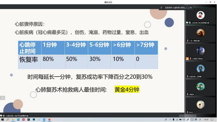本次主题活动主要以线上形式展开,由公司青年志愿者协会副会长张悦主持。本次活动主持人首先带领同学们回忆了前段时间的韩国梨泰院踩踏事故,来引起同学们对急救知识的重视以及对生命的敬畏。随后由新乡医公司的主讲人为同学们进行CPR的培训讲解。讲解中包含了心肺复苏的相关概念及适用情况,让同学们了解什么是“黄金4分钟”。同时也教给同学们AED(自动体外除颤仪)的使用。主讲人也通过讲解和视频展示的方式一一讲述了心肺复苏的操作步骤、常见错误以及注意事项,让同学们接触到社会生活中的医学。最后又介绍到心肺复苏的终止条件,让同学们全方面了解心肺复苏的操作过程。
