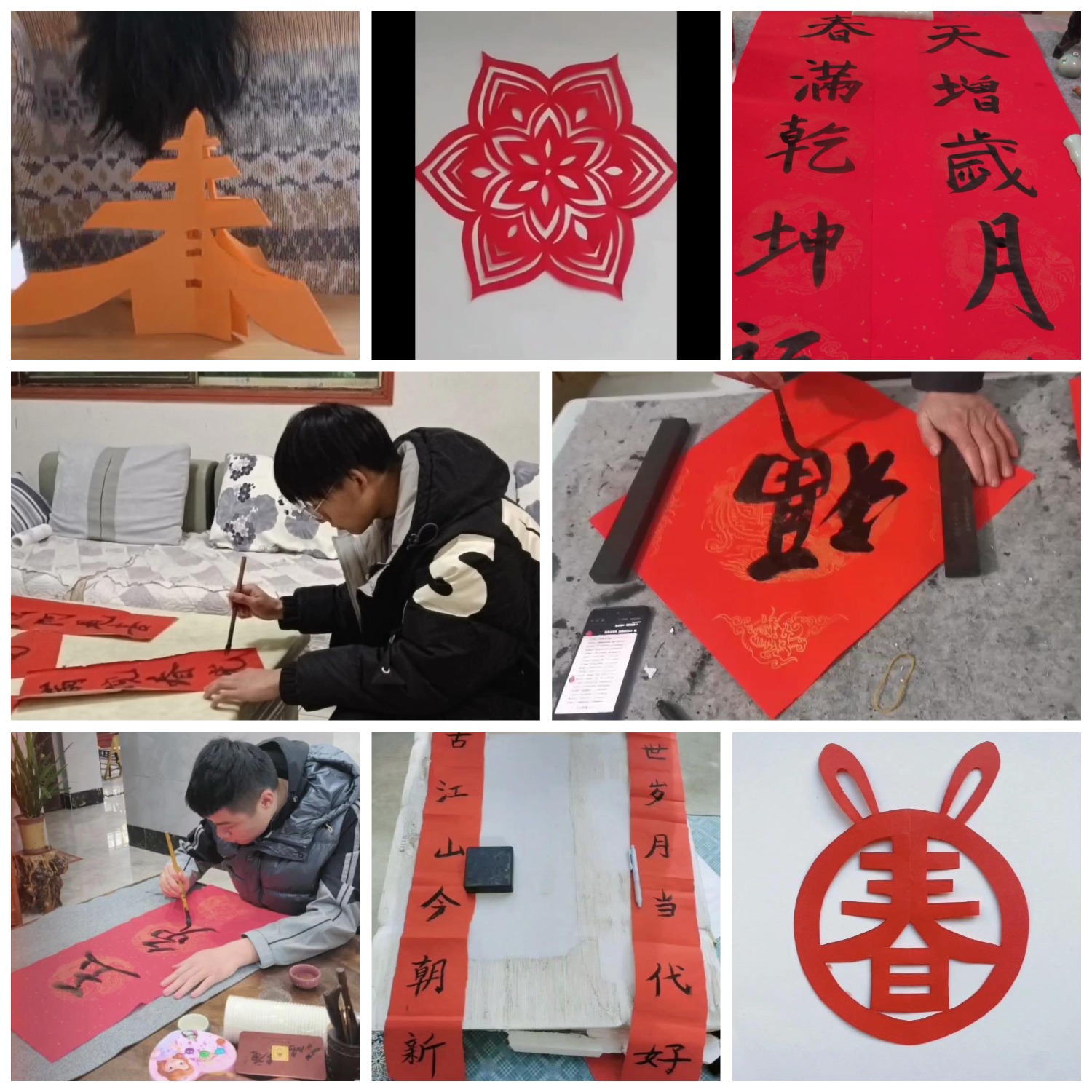 此次活动内容围绕春节,通过剪纸、贴福字、书写对联等追寻年味的方式进行制作并以视频的形式呈现。一幅幅洒满平安吉祥的火红春联,一张张铺满新春祝福的精巧剪纸让新年的氛围跃然纸上。同学们挥毫泼墨,热情书写“福”字、春联,有“千古江山今朝新,百世岁月当代好”“万事如意岁岁高,一帆风顺年年好”。同学们学习传统手工技艺,感受传统文化魅力,让一张普通的红纸在剪刀的作用下变成富有节日气息的装饰品。