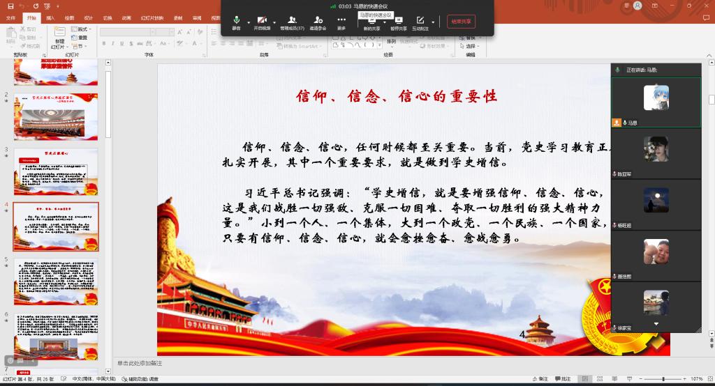本次活动由各团支书担任主讲人,以PPT宣讲的形式带领同学们学习家国情怀的基本内涵和时代意义,树立坚定理想信念。首先,主讲人从信仰、信念、信心的重要性开篇,讲述到“有多坚定的信念,就有多勇毅的行动;有多强大的意志,就有多光明的未来。”并依次向同学们介绍了道路自信、理论自信、制度自信、文化自信,提到“坚定必胜信心,人民生活幸福美满”。接着从“厚植家国情怀的意义、根植中华民族文化沃土,涵养家国情怀、塑造新时代民族精神,培育家国情怀、青年更当厚植家国情怀”四方面引领同学们深刻感悟家国情怀。最后,主讲人表示到“青年人应将个人理想融入到国家和民族的事业中,以爱国情、强国志、报国行的勇气与决心,绽放青春之彩,让厚植家国情怀的青春熠熠生辉。”