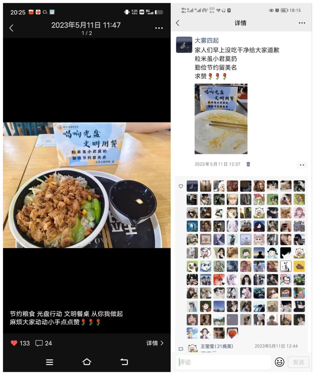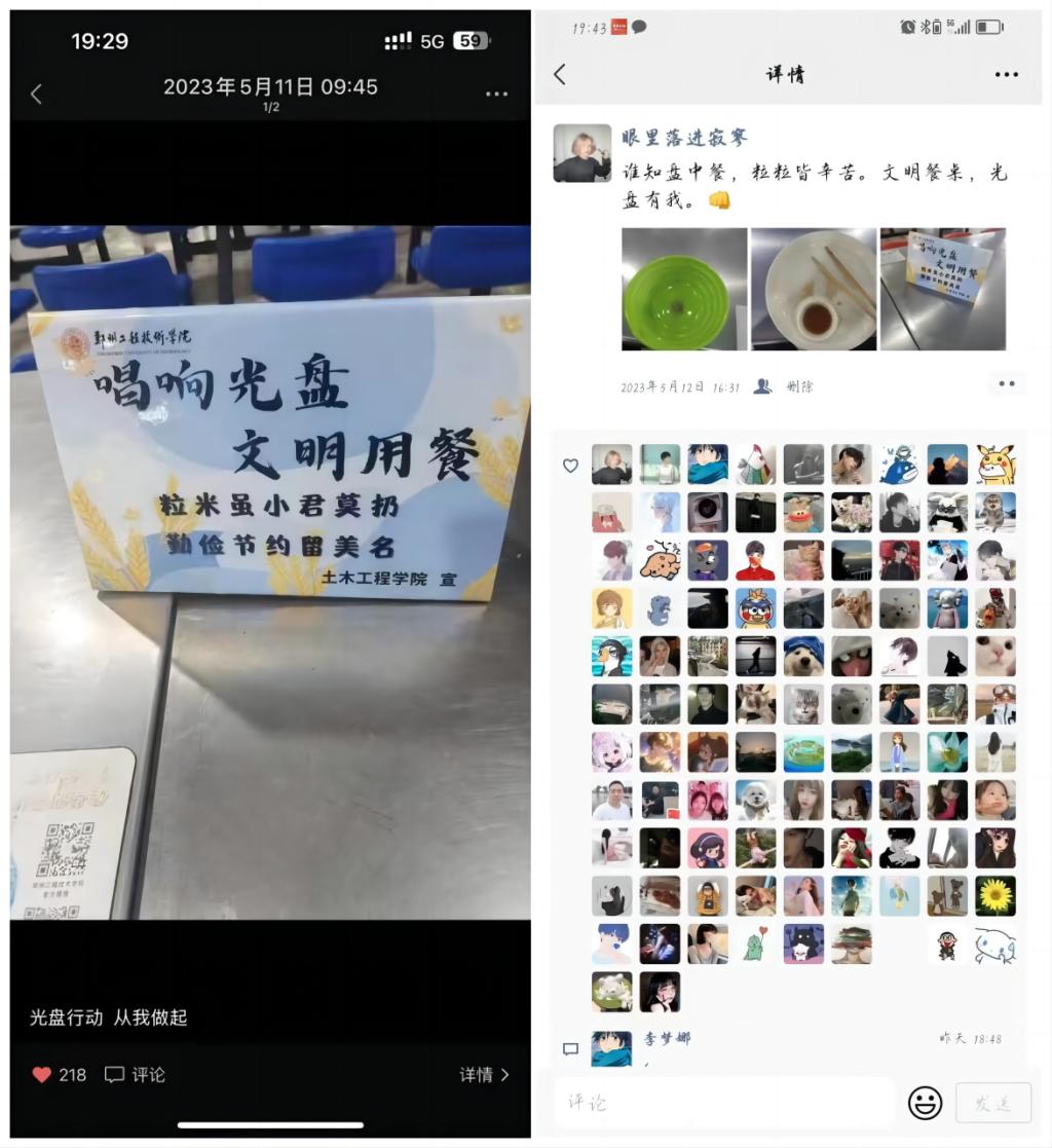 活动一经推出,同学们就积极踊跃参加。活动期间,工作人员在餐厅中摆放了“响应光盘,文明就餐”等有关的宣传标语,时时刻刻提醒着同学们去文明就餐,拒绝浪费。在本次活动的号召下,餐厅变得更加干净整洁了,倒进剩饭桶里的饭更少了。除此之外,参加本次活动的同学们,在多个社交平台晒出自己的“光盘”,鼓励身边更多的家人、朋友落实光盘行动。