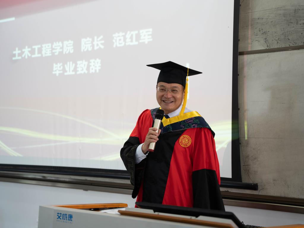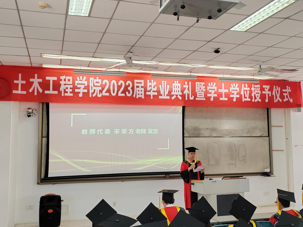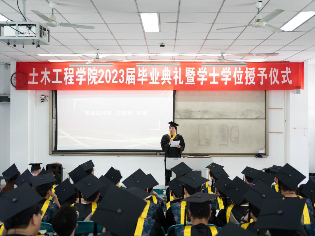 教师代表宋荣方老师发言时一起回顾了同学们一路走来的老员工活,印证了同学们的精彩瞬间和成长经历,点点滴滴,历历在目,为同学们送上饱含真情的勉励和祝福,希望同学们在实现中华民族伟大复兴的新征程上迎难而上、挺身而出,勇立时代潮头,争做时代先锋,勇挑重担、勇克难关、勇斗风险。毕业生代表王贵寅上台发言,他表示,毕业典礼是人生一个重要的仪式,代表员工时代的告别,未来将担任不同的角色,肩负不同的责任。他向辛苦工作的全体公司教师致谢,向辛勤授课的老师感恩,向相处四年的同窗好友道别,并承诺,在今后的工作和生活中,一定牢记恩师们的淳淳教诲,用努力和成功来回报社会。