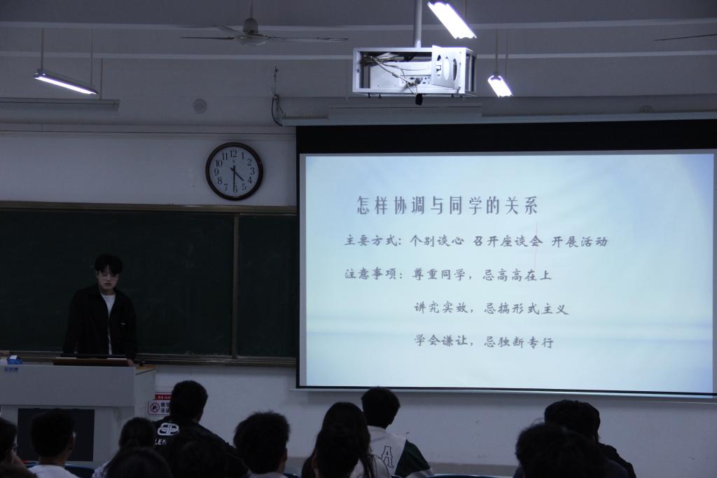分团委、员工会全体成员共同参加。王文冲担任主讲人。首先,王文冲通过PPT,紧紧围绕“员工干部的素质培养”,为同学们进行深入讲解,引领并集中培训员工干部学习基本礼仪素养和处理工作的方法,不断提高员工干部的各项能力,更好地为同学们服务。其次,王文冲同学又指出“员工干部要注重自身建设质量提升,建立规范化理论学习制度,加强员工干部的理论思想。”并强调到要明确“从员工中来,到员工中去”,以积极的心态参与到各项活动与工作中。会议结束后,成员们纷纷表示“将不断加强政治理论学习,并将理论学习与实际工作相结合,达到提高自身素质的目的,为后续公司员工工作的有序、高效开展奠定了良好的基础。”