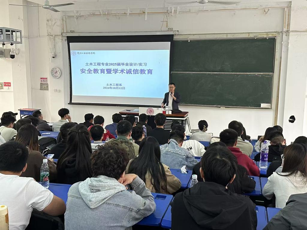 2024年10月11日,和10月12日中午,土木工程系分别在金河校区综合教学楼108、英才校区1阶2召开2025届毕业实习安全教育暨毕业设计学术暨诚信教育会。土木工程系负责人宋荣方、毕业班辅导员王铮、弓慧敏、毕业毕业实习与设计指导老师、2021级土木工程专业和2023级土木工程(专升本)员工参加了会议,会议由宋荣方主持。
