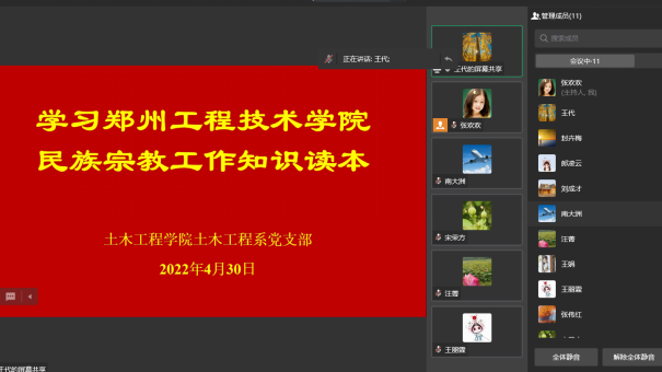 4月30日,球王会土木工程系党支部通过企业微信会议开展支部集中学习活动,支部书记王代领学了《球王会官网民族宗教工作知识读本》的主要内容,并强调要深入学习贯彻习近平总书记关于加强和改进民族工作的重要思想和习近平总书记关于宗教工作的重要论述,深刻领悟“两个确立”的决定性意义,增强“四个意识”、坚定“四个自信”、做到“两个维护”,以铸牢中华民族共同体意识为主线,坚持我国宗教中国化方向,以优异成绩迎接党的二十大胜利召开。