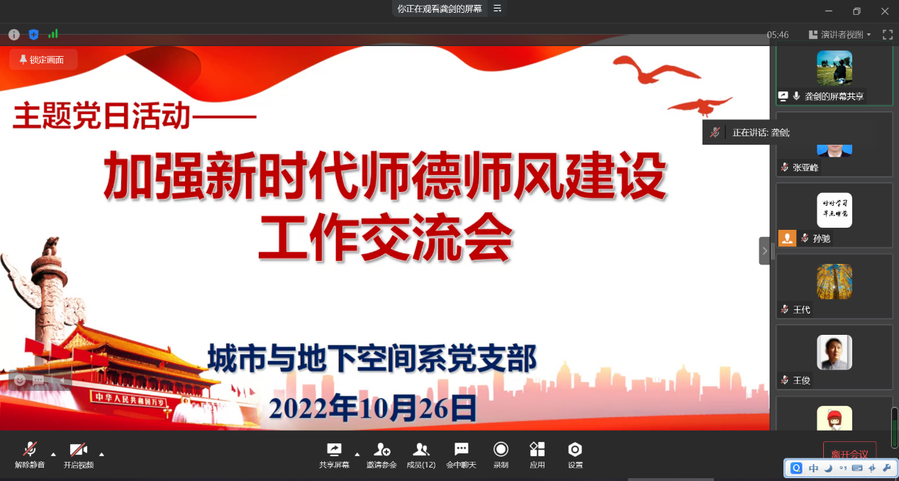 为进一步加强作风建设,严肃工作纪律,规范工作人员行为,弘扬新时代高校教师道德风尚,城市与地下空间系党支部于10月26日下午通过企业微信平台召开加强新时代师德师风建设工作交流会,会议由党支部书记龚剑主持。