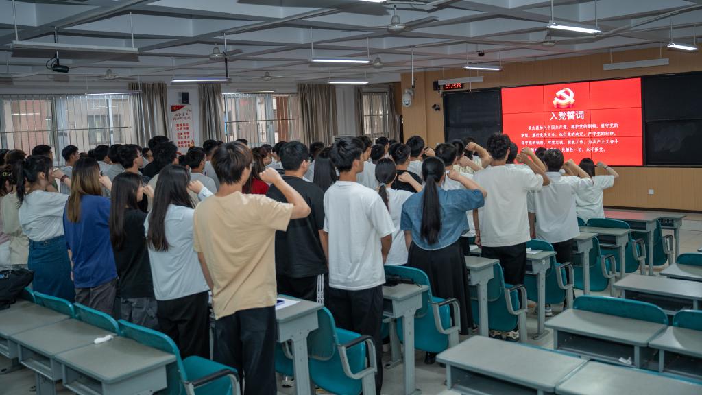 紧接着,进行了入党宣誓仪式。在鲜红的党旗下,新、老党员们身着整齐的服装,庄严地举起右手,高声宣读入党誓词,铿锵有力的誓言回荡在教室内,震撼着每一位在场党员的心灵。宣誓结束后,新党员们纷纷表示,将牢记誓词,不忘初心、牢记使命,以实际行动践行共产党员的庄严承诺。