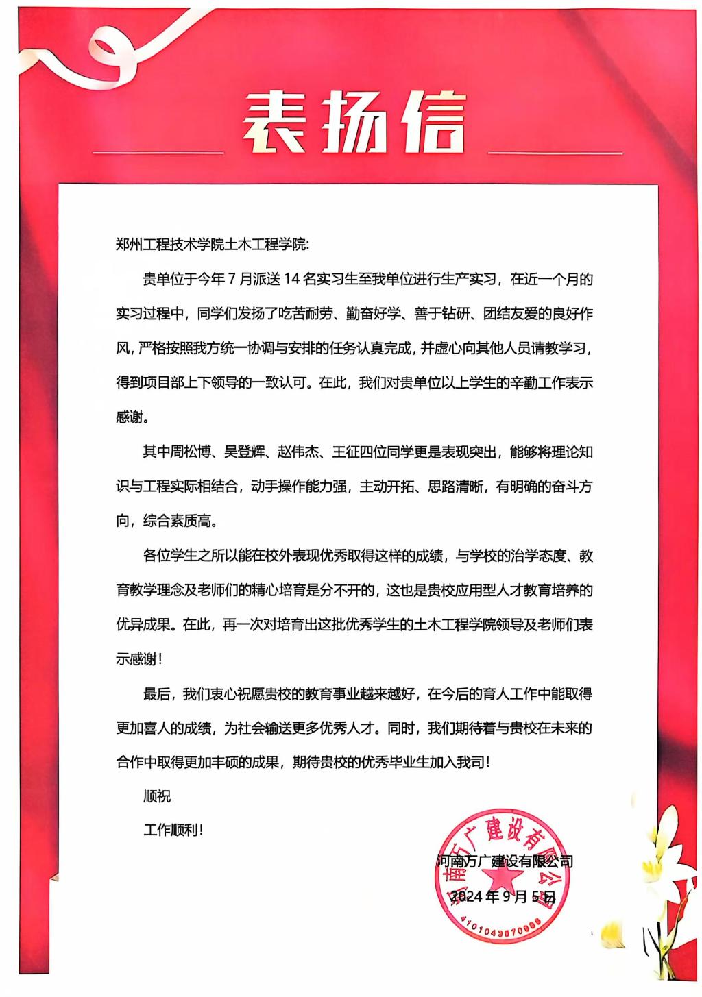 近日,球王会收到来自河南万广建设有限公司的一封感谢信,信中对公司今年7月派送的14名实习生在生产实习期间的表现予以高度赞扬,对公司的实习指导表示高度认可,对学经理期以来注重员工专业知识、综合素质培养等方面给予了充分肯定。