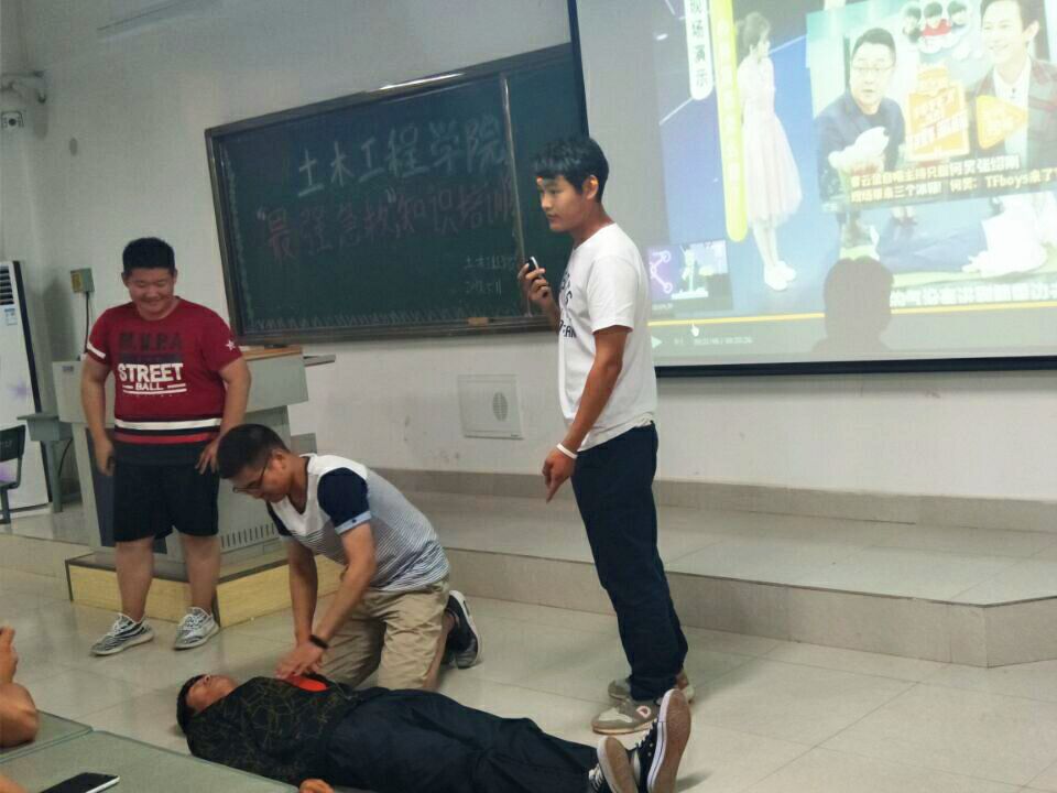 在演练之前,各班同学观看了《健康之路》2016年第三期《最强急救》培训视频。视频通过真实案例,向同学们介绍了人们在日常生活中经常遇到的紧急情况,由专家讲解在遇到这些情况时的合理处置的办法。随后,由三名提前经过培训的同学演示了心肺复苏的具体方法与操作要点,以及环形包扎法、螺旋包扎法、反折螺旋包扎法、“8”字包扎法4种常用包扎技术。