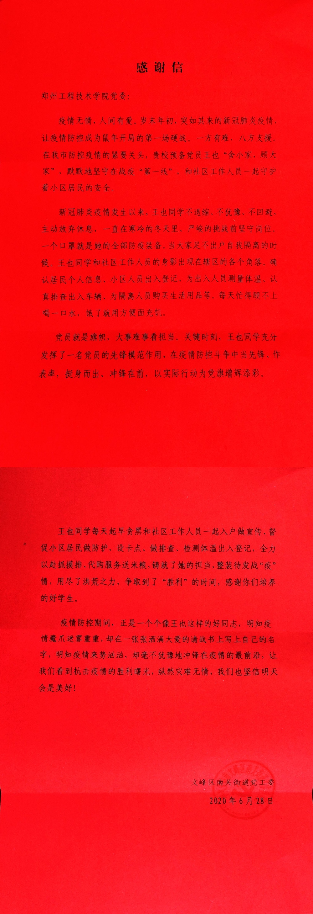 近日,公司收到一封来自安阳市文峰区南关街道党工委的感谢信。信中描述了2019级土木专升本1班王也同学在防控疫情的紧要关头,“舍小家,顾大家”,默默坚守在战“疫”第一线,和社区工作人员一起守护着小区居民的安全。