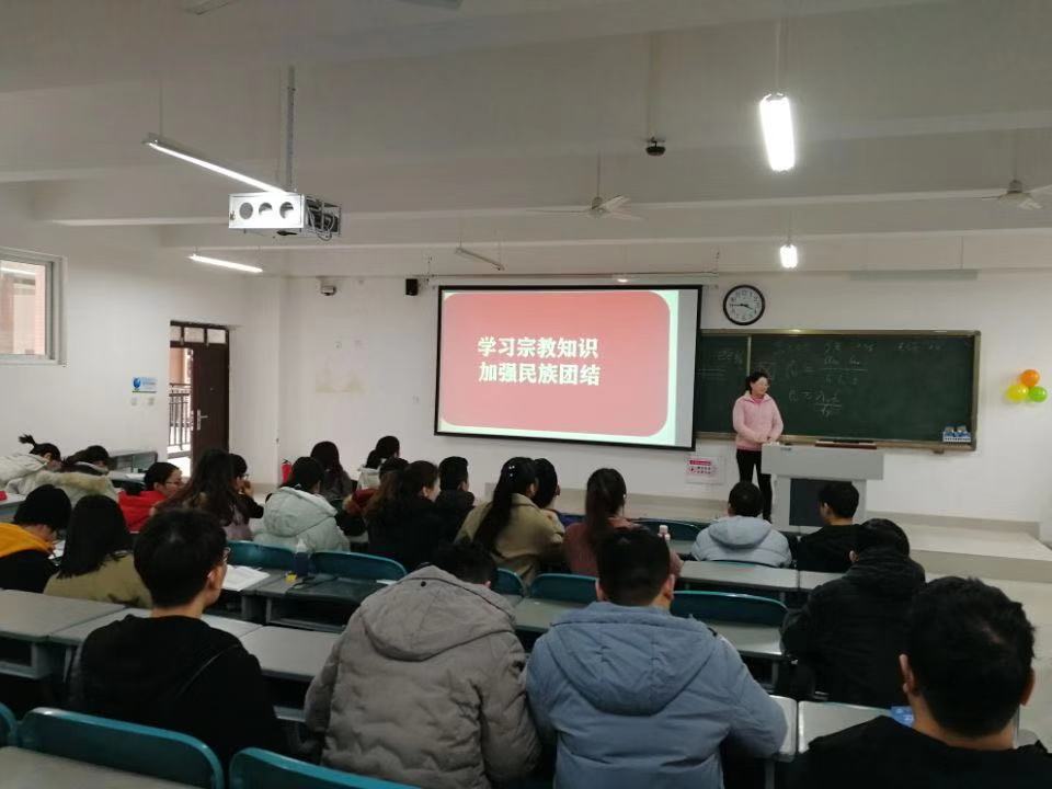 2018年10月9日,球王会土木工程专业全体员工在金河校区综合楼202教室举行学习宗教知识加强民族团结班会。班会由18级辅导员陈可老师主持。