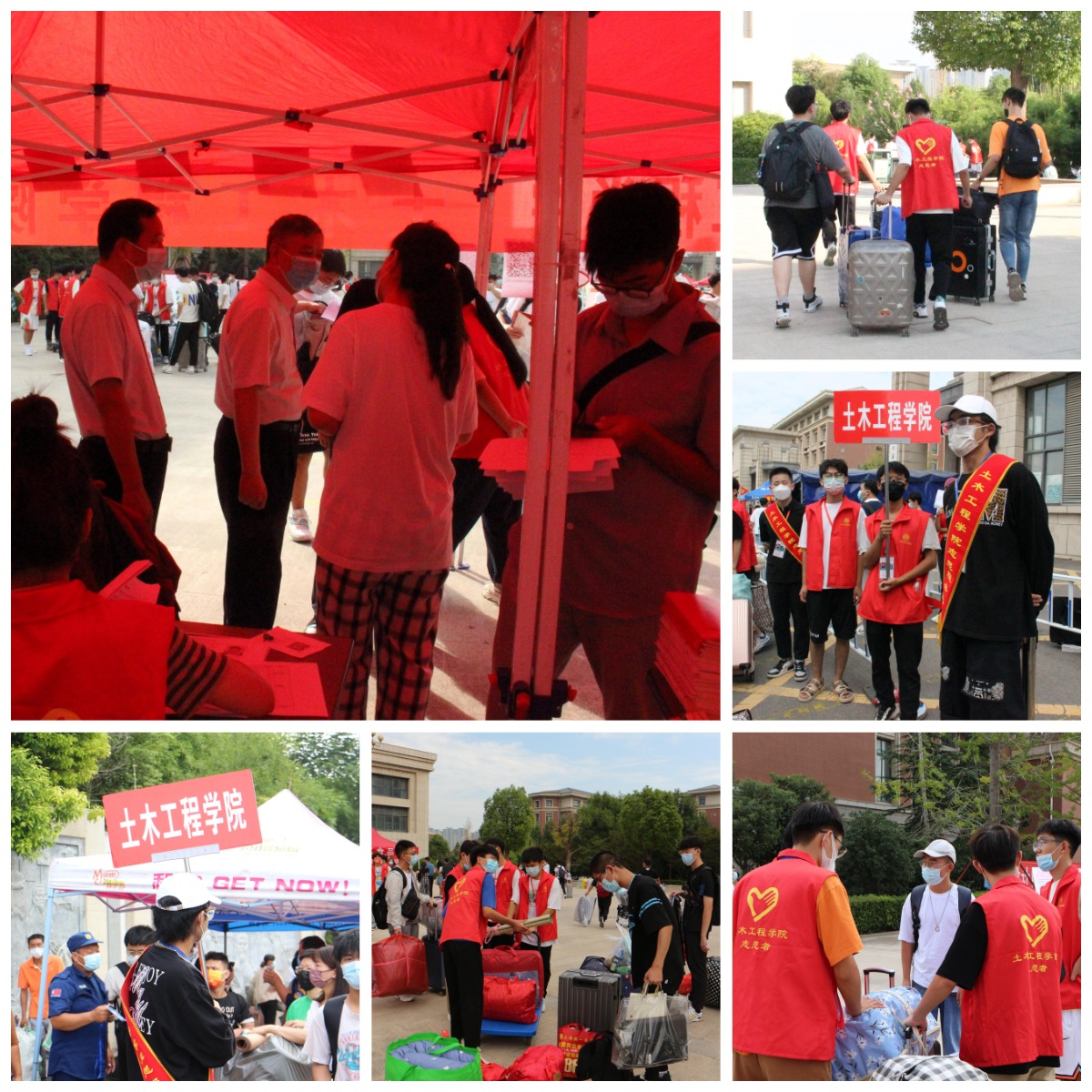 早上7点,志愿者准时到场签到,准备就绪,配合学工办老师做好各项准备工作。在此次迎新工作中,按照迎新任务分为:引导报道、维持秩序、报道登记以及运输行李,每一项工作均安排有多位志愿者负责。在报道登记处根据专业和班级的不同布置了四个接待点,每一个接待点安排有两名志愿者负责接待。同时,在等待登记时,志愿者提醒同学带好口罩,保持一米间距,并协助完成线上报道步骤,避免新生报道拥挤现象。当新生进校时,志愿者们主动帮拎行李,指引他们报道方向。报道结束后,志愿者们也会帮其搬运行李,往返于迎新点和新生宿舍之间。在此期间,志愿者们耐心的对新生报道中的疑问进行解答。