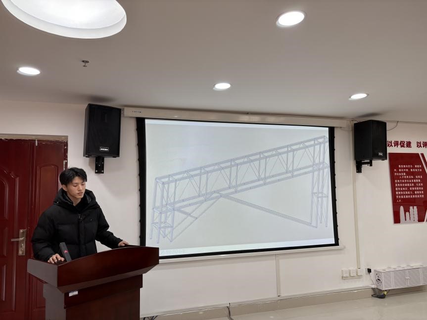 各参赛队伍以多媒体形式进行汇报,针对设计成果、建模遇到的问题和解决方案、心得体会等方面展开描述。各评委老师通过员工所讲述的设计理念及计算结果给出意见和建议,现场同学认真聆听汇报人的讲解,相互学习模型方案,经评审10支队伍进入了模型制作阶段。