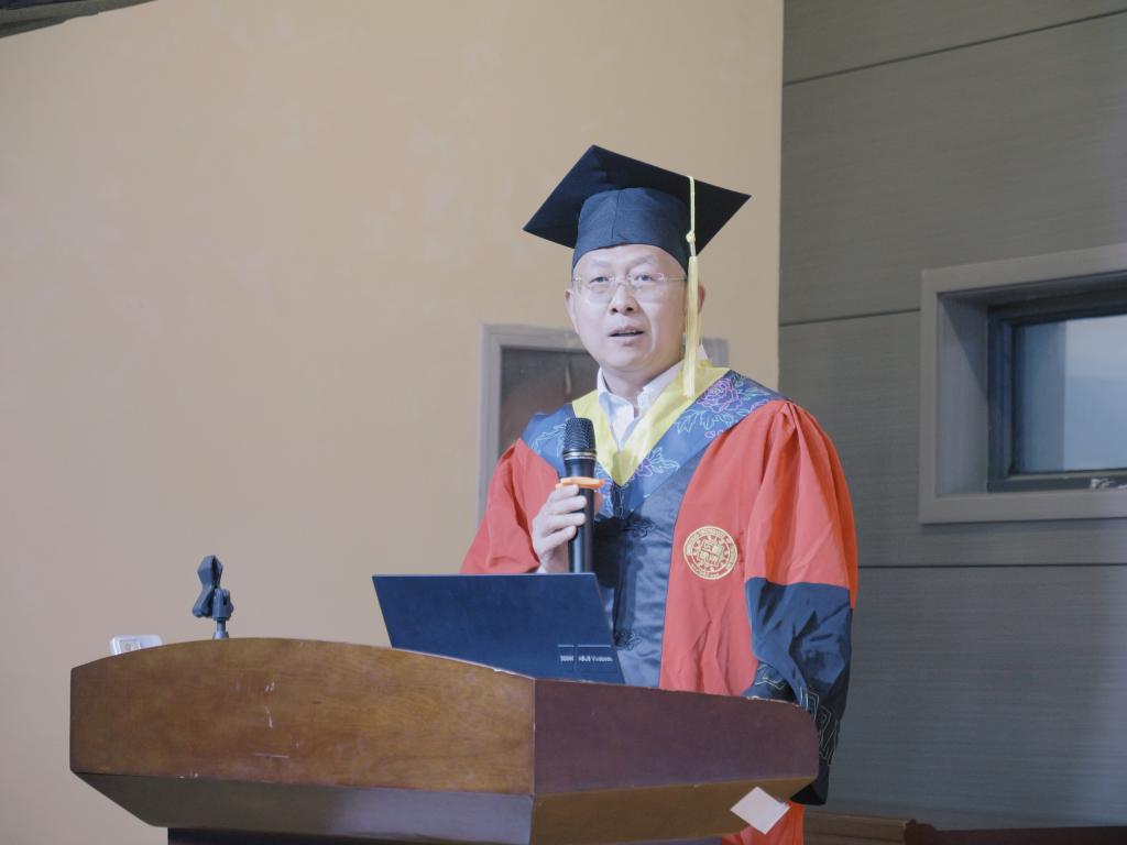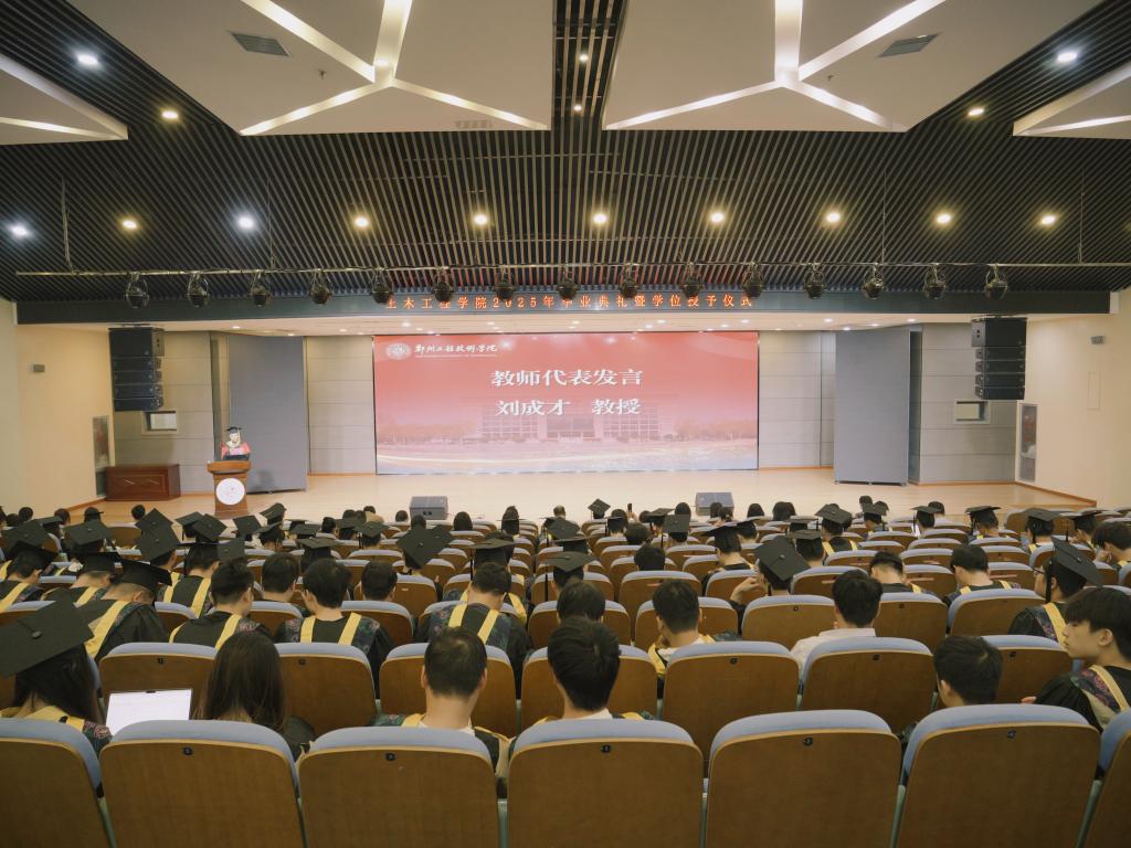 教师代表刘成才教授从回首往昔,见证成长,共享荣光、立足当下,深情寄语,殷切期望、面向未来,终身学习,创新致远、心系母校,扬帆起航,筑梦未来四个方面寄语2025届毕业生:希望各位同学始终保有仰望星空的理想,坚守脚踏实地的作风,秉持终身学习的态度,激发创新创业的激情。在未来的岁月里,用智慧和汗水,在神州大地上,书写属于新时代土木人的壮丽诗篇!