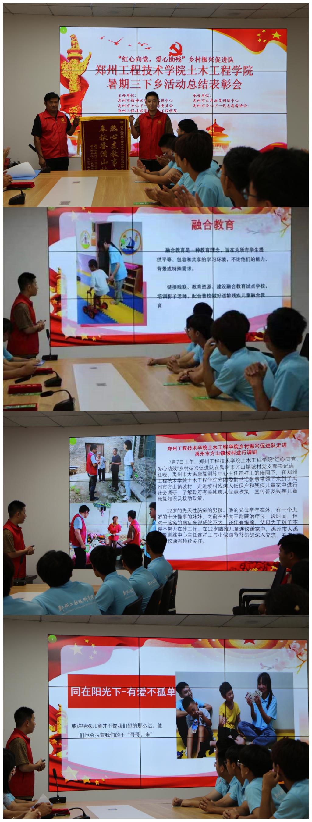 本次社会实践活动由球王会分团委副书记张慧全程带队,深入走进禹州市社区、农村、康复机构等,以入户调研、问卷调查、助教等多种形式来全面了解禹州残疾人生活现状、残疾儿童康复情况及孤独症社会关注度,为乡村振兴注入青春力量。在活动期间,实践队员们先来到大禹康复训练中心进行助教活动,与康复训练师一起进行对残疾儿童的康复训练,与孤独症儿童交流玩耍,近距离接触孤独症儿童,认识孤独症。接着,实践队员们在大禹康复训练中心的连祥工老师的带领下一同来到禹州市方山镇坡村进行实地调研,前往残疾人家中深入了解其家庭情况与生活状况。并依据实际调研情况来提供力所能及的帮助,送去温暖与鼓励。此外,实践队员们还积极参与了“禹州市融合教育进校园主题宣讲志愿服务活动”,促进“融合教育”的认识与推广。同时,实践队员们通过向市民发放调查问卷了解社会群众对孤独症的关注度。实践队员们不惧辛苦,以认真、细心、耐心的态度完成每一项社会实践活动,使其收益匪浅,磨练了意志,丰富了经历,收获了成长。最后,本次社会实践活动得到禹州政府相关单位的肯定,并在禹州市精神文明促进中心会议室举办此次暑期“三下乡”社会实践活动总结表彰会,对本次参与社会实践活动的实践队员们进行嘉奖。
