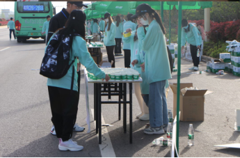 到达指定地点后,同学们迅速吃过早饭,开始清点物资。主办方临时通知在25km设立测速点,需将全部物资向后搬移150m。同学们迅速集合分配任务,一半男生运送物资 一半男生布置水站,在有限的时间里大家团结一致完成了物资的搬运和水站布置。