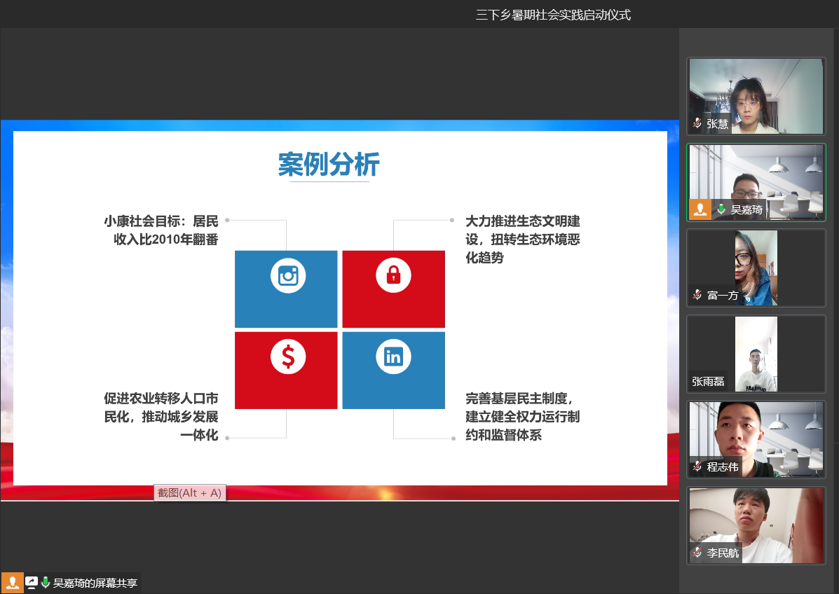 6月15日,2022暑期社会实践活动启动仪式,在线上正式拉开帷幕。以“青春心向党,献礼二十大”为主题,旨在引导和帮助广大青年员工在社会课堂中受教育、长才干、作贡献,带领青年员工在实践中感悟国民发展,感受全过程人民民主的生动实践,形成正确认识,坚定理想信念,以优异的成绩迎接党的二十大胜利召开。分团委副书记张慧老师和全体社会实践人员参加会议。