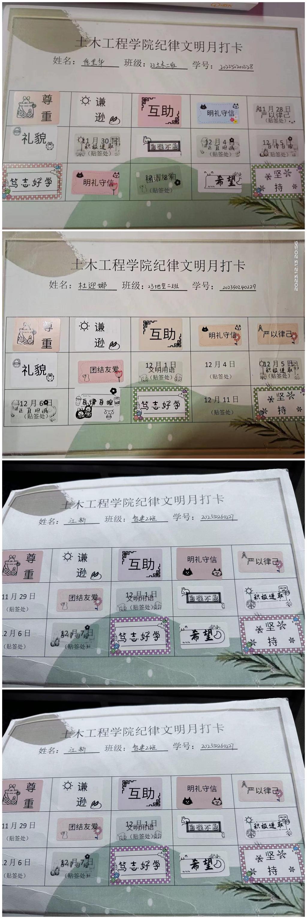 本次活动以线下打卡签到的形式进行,参与活动的同学们提前领取员工会制作的精美打卡明信片,活动期间每天早上七点半到七点五十之间在综合楼底下打卡点领取小标签进行打卡签到,以达到鼓励同学们早起学习的目的。同时,工作人员还设有纪律文明标语,同学们纷纷在条幅上签名,立下承诺。同学们对本次活动的积极性,彰显了土木学子朝气蓬勃的精神风貌和锐意筑梦的青春风采。22级智能建造一班刘文静同学表示,要以此次活动为契机,严格要求自己,在今后的生活中从思想上牢固树立正确的纪律观念,时刻保持清醒头脑,做到警钟长鸣,扎实做好学习工作。