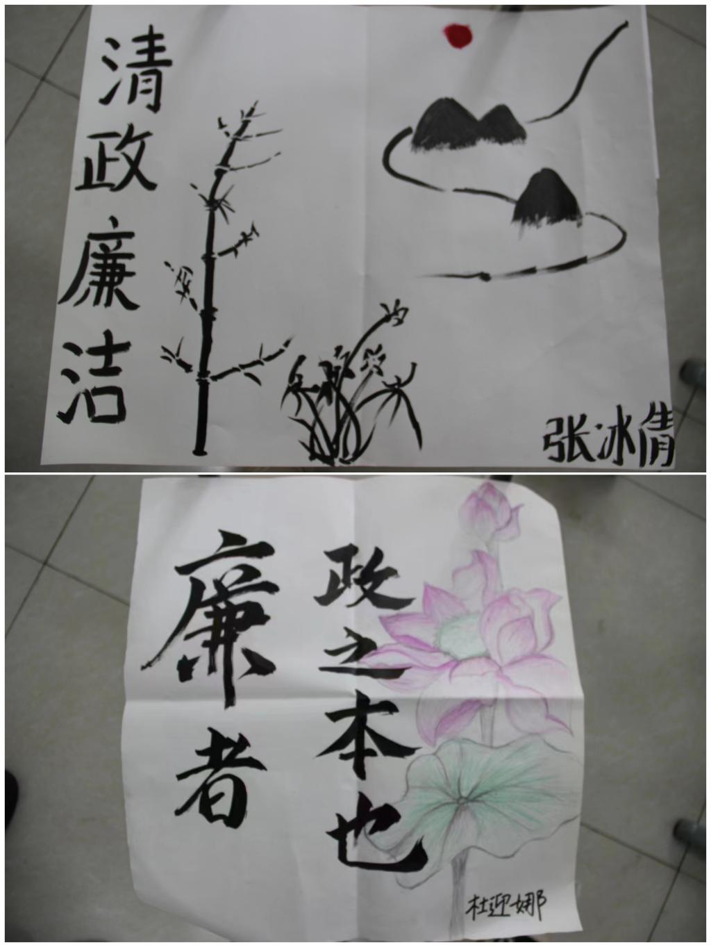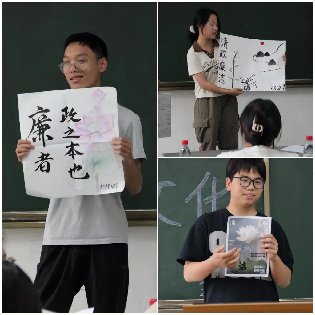 活动开始,主持人先着重讲解了清廉的重要性,使现场观众对廉政文化有了更为深刻的理解。接着到了同学们展示作品的环节,同学们通过书法、绘画、摄影、海报等多种形式,将自己对清正廉洁的理解与感悟融入作品中,展示了他们对这一主题的深刻见解。在书法作品中,同学们以铿锵有力的笔触书写着“廉洁自律”的誓言,传递出对清正廉洁精神的崇敬与追求;在绘画作品中,他们用丰富的色彩和细腻的笔触描绘出了一幅幅寓意深刻的廉洁画面,展示了清正廉洁精神在现实生活中的生动体现;在摄影作品中,同学们捕捉了校园中廉洁自律的感人瞬间,用镜头记录下这些美好的画面等等,他们用心诠释“廉政”的含义,让清正廉洁的精神在校园中生根发芽。